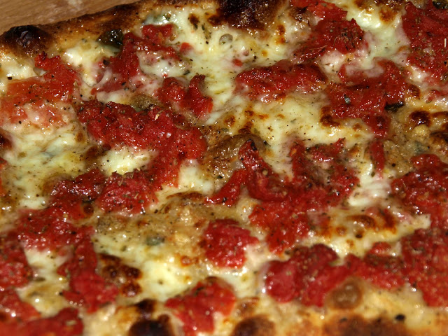 -Bake on pizza stone for approximately 4-5 minutes until edges are dark brown and cheeses are bubbling (watch carefully as these pizzas will cook VERY fast)