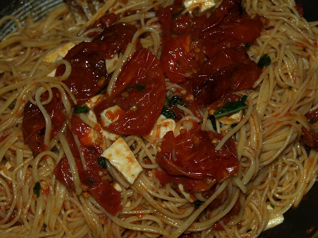Slice tomatoes in half, toss with garlic infused EVOO (sliced garlic that had been sitting in EVOO for 30 minutes) and place on a baking sheet. (If you want to put the fresh garlic in the oven either whole or sliced, it will roast and impart a great flavor. As well, keeping the garlic sliced or whole instead of crushed will allow you to control the amount of garlic eaten and your kitchen will also smell great for hours