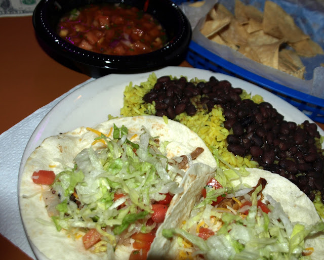 I ordered the soft flour carnitas (pork) taco combination plate and Sandy ordered the ground beef tacos in the crispy corn tortillas. Both were served with refried beans and yellow rice and topped with cheese, lettuce and pico de gallo. Corn chips and salsa also accompanied our meal. A complement of Mexican beer and friendly & helpful servers leaves you pleasantly full and with room for dessert.