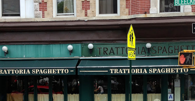 The next thing that caught my eye as I was cruising down Bleeker Street over to Gansevoort was a cool looking Italian restaurant by the name of Trattoria Spaghetto. I just loved the name and the look of the place and had to stop and take a picture. At that same moment, a hear a voice next to me asking if the restaurant is famous. I guess since I was taking a picture, one might think the location had a history to it...but I explained to the next sincerely nice person I had the pleasure to meet today that it was simply the look that caught my eye.