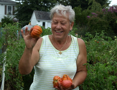 In 2010 I wrote about Cheryl’s on River Road in Calverton and her fabulous cherry tomatoes …in 2011 I wrote about Joanne Zelnicki on Sound Avenue and her brilliant “Champion” tomatoes. For 2012, even though I want her all for myself, I have to share with all of you Flora The Santorini Tomato Maven.